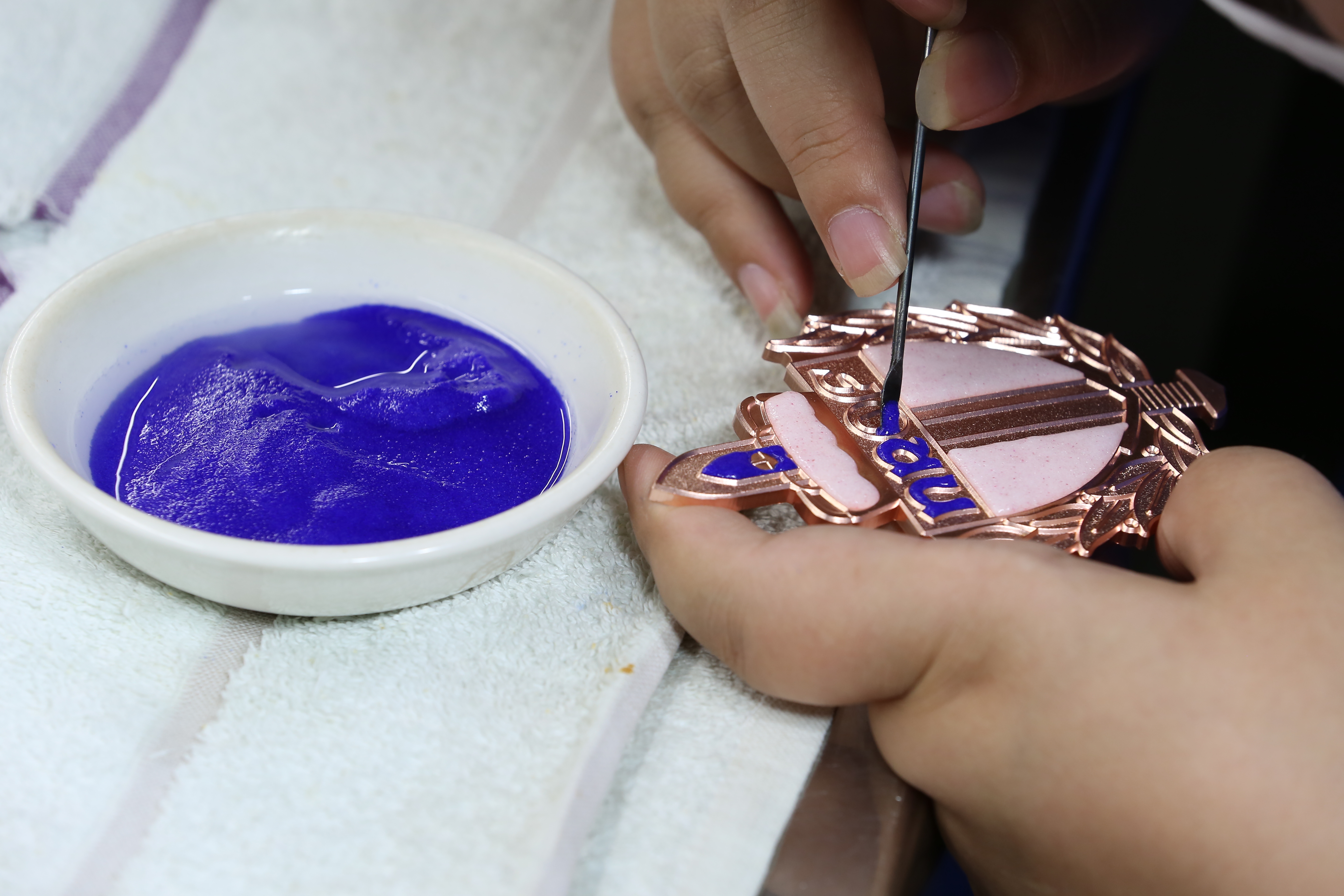 琺瑯徽章的制作流程:制圖——曬版——咬模版——刻模——切模——壓沖——上色——高溫?zé)?mdash;—磨石——修補(bǔ)——拋光——焊配件——電鍍——品檢——包裝